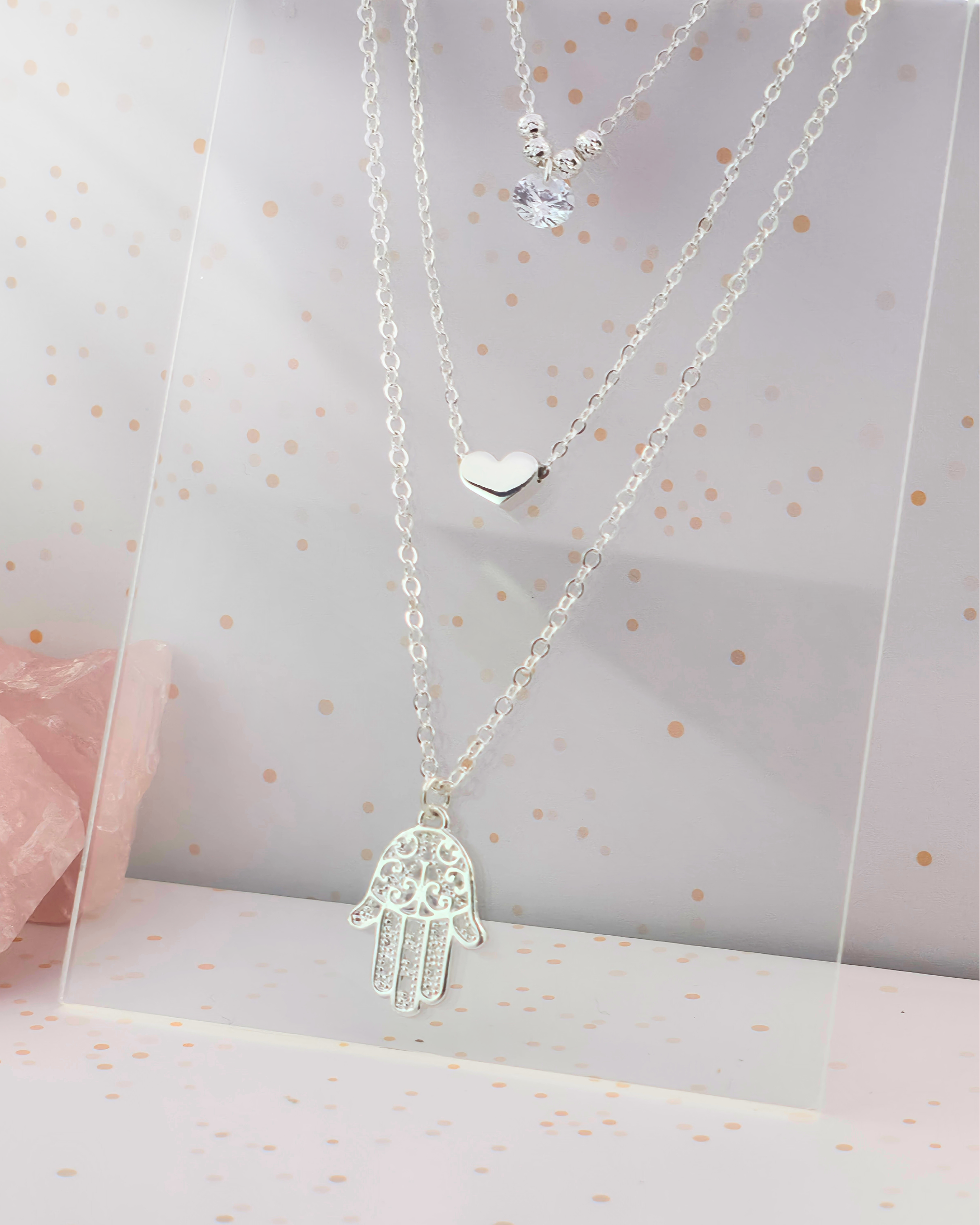¡Envío Gratis a todo México en compras a partir de $1,999!Es un collar triple unido en una sola cadena, tiene un dije de mano de Fátima, zirconia blanca y un delicado corazón.